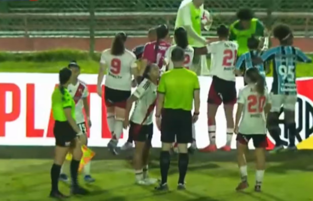 Después de la trifulca en el campo de juego, seis futbolistas fueron expulsadas. Todo ocurrió luego de que el equipo brasileño empatara el partido en el primer tiempo. Después del empate de María Dias, Gisele, jugadora de Gremio, festejó mostrándole el escudo a las jugadoras de River, lo que desató la furia de las argentinas.