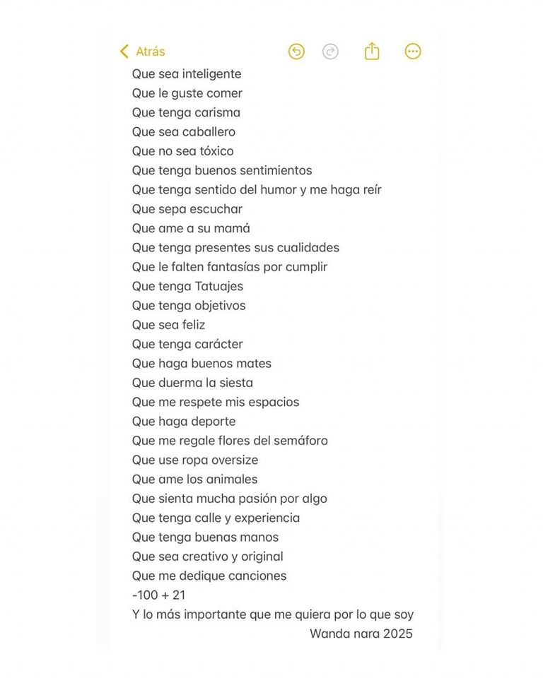Son 29 ítems de lo más variados, desde “ser inteligente”, hasta “hacer buenos mates” y que “duerma la siesta”. “Que tenga buenas manos”, publicó, exponiendo uno de sus fetiches.