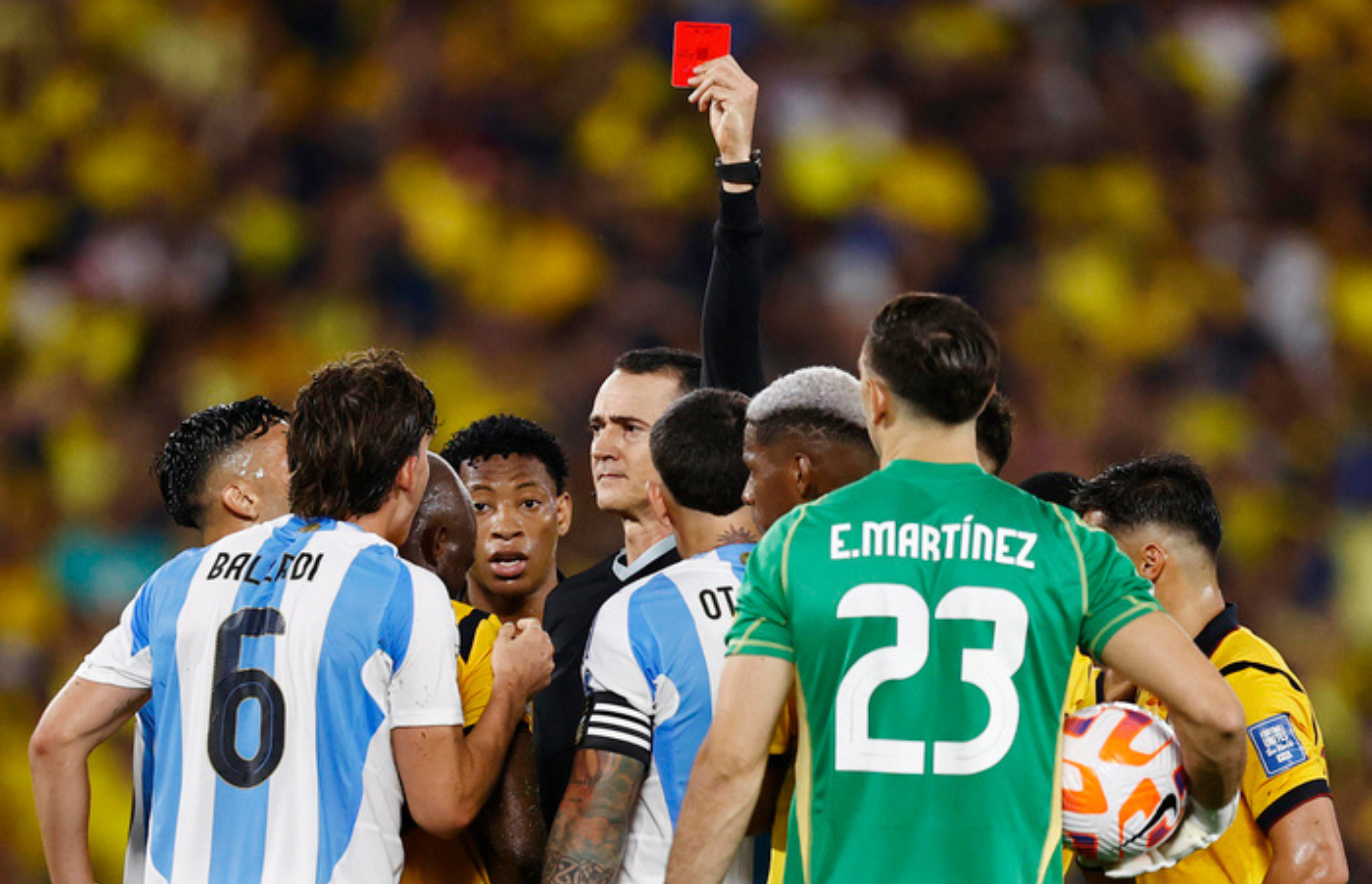 El defensor recibió la tarjeta roja directa a los 30 minutos del primer tiempo, cuando derribó a Enner Valencia en una acción que evitó una ocasión manifiesta de gol. El árbitro colombiano Wilmar Roldán lo expulsó de manera inmediata, en lo que significó la primera expulsión de Otamendi en 128 partidos con la camiseta nacional.